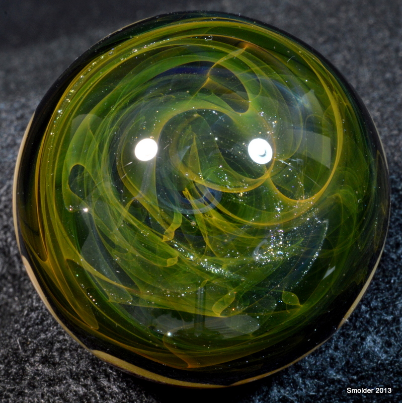 I really started concentrating on marbles almost two years ago. I've always loved the simplicity of a sphere and I try to make it as complex and interesting inside as I can to create a strong contrast between the smooth contours of the surface. I love fuming and it is showcased in some way or another in almost all of my work.