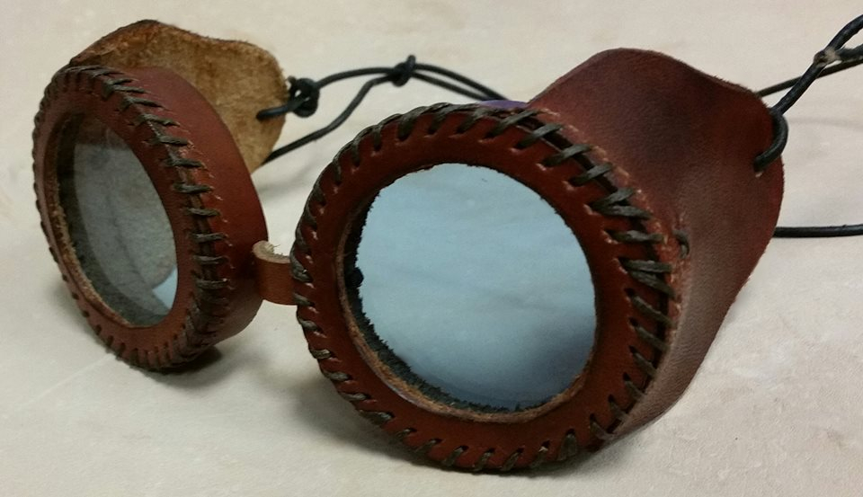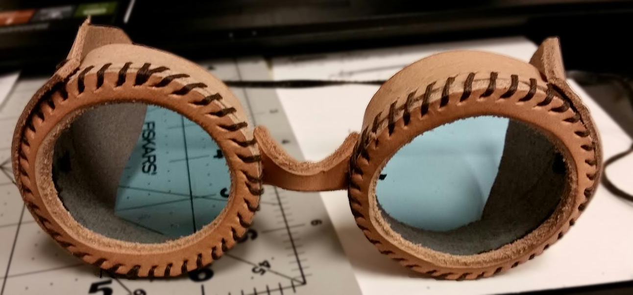 Anyways, I got to the point where I wanted my own eye protection and I'm a hands-on kinda person, plus being in the SCA and knowing some leatherworking, I decided to give goggles a shot. Bought some lenses and got to work, I'm going to dye them later (turns out veg tanned leather undyed looks creepy as hell when being worn, it's a bit Texas Chainsaw Massacre looking) Gave them a test run last night and actually fit quite comfortably, especially over the ears (which was my biggest issue with other glasses I've worn)