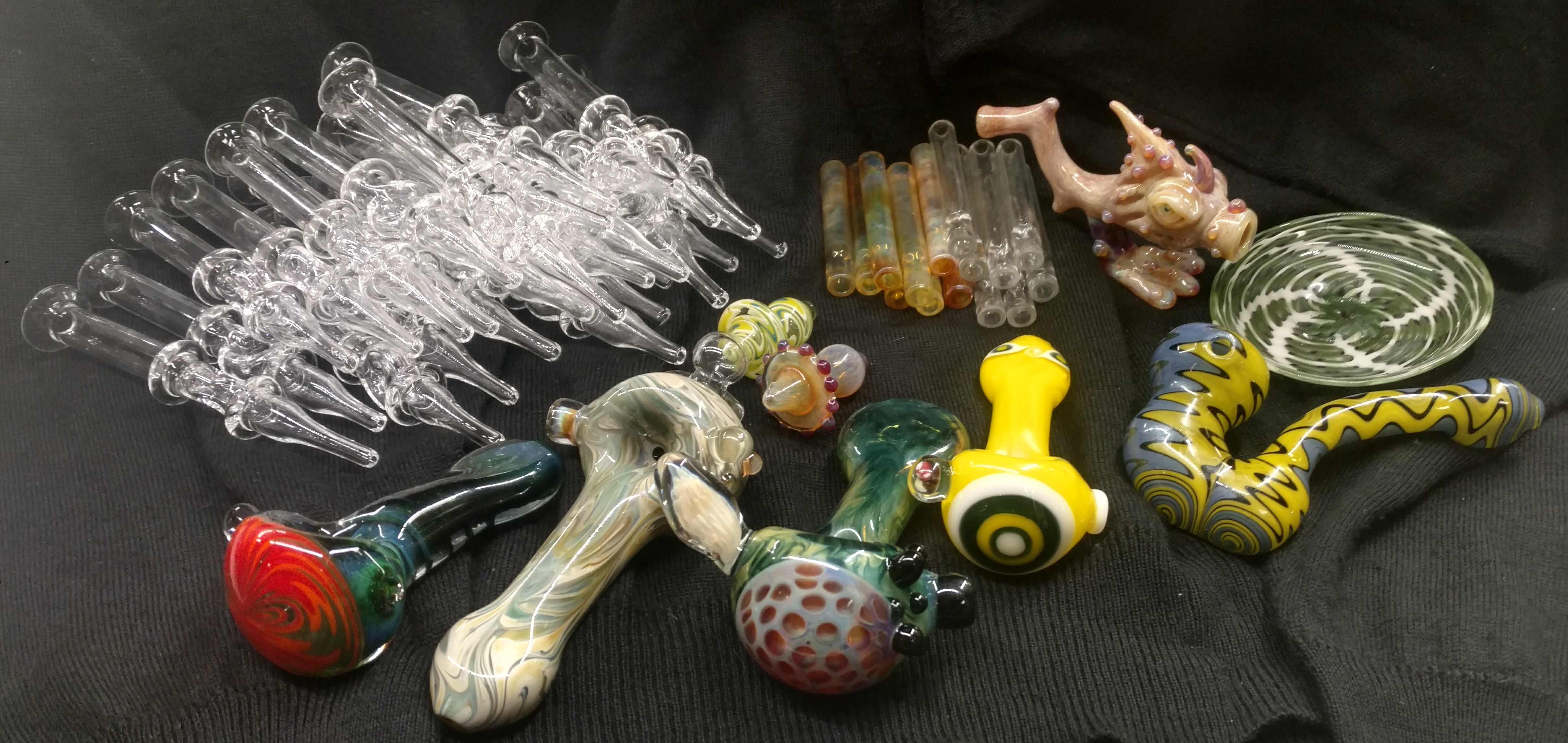 I have a small wholesale package available. 25 doughnut straws, 15 hitters (7 clear, 8 silver fumed), 10mm scuplted extract straw ('Rock Monster', doesn't come with a tip), 4 hand pipes, three carb caps, a dish, and a sherlock. Asking $475 and includes shipping, obo. @whatitisg on Instagram. Email gives me notifications, troydglass@gmail.com, or message on IG. Thanks ~G