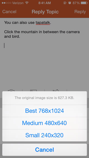 Tapatalk has a built in image resizer. Choose your size.